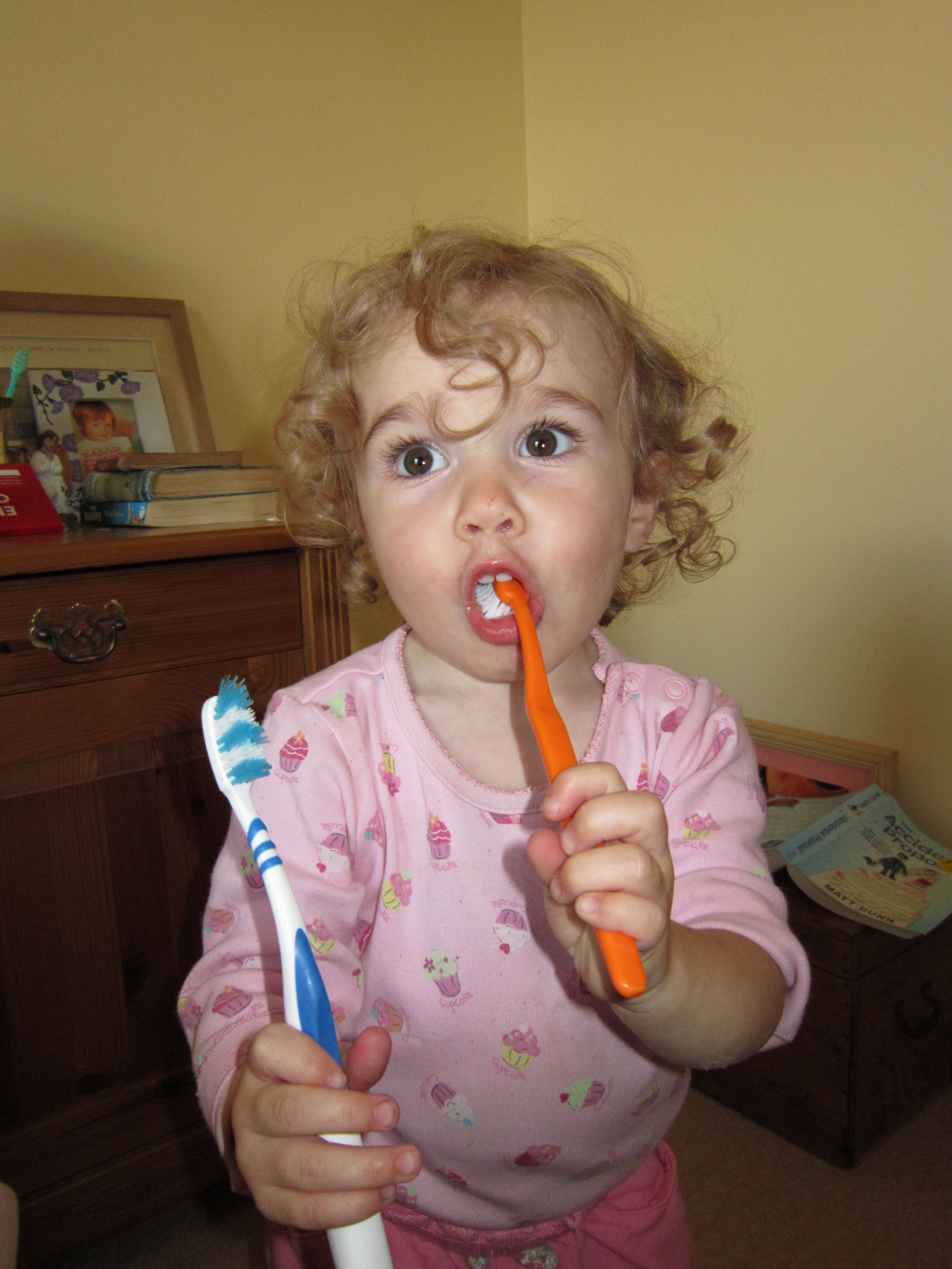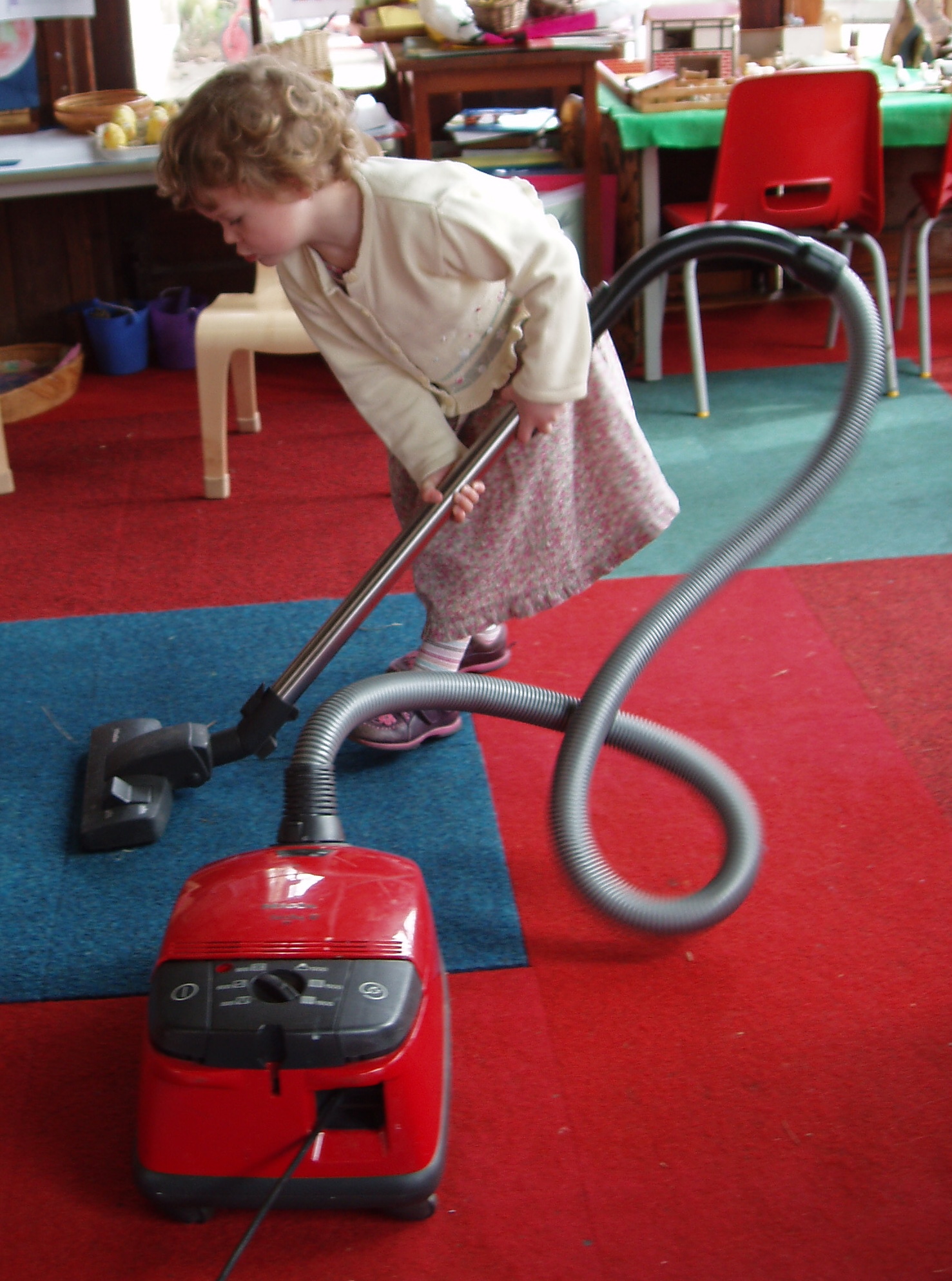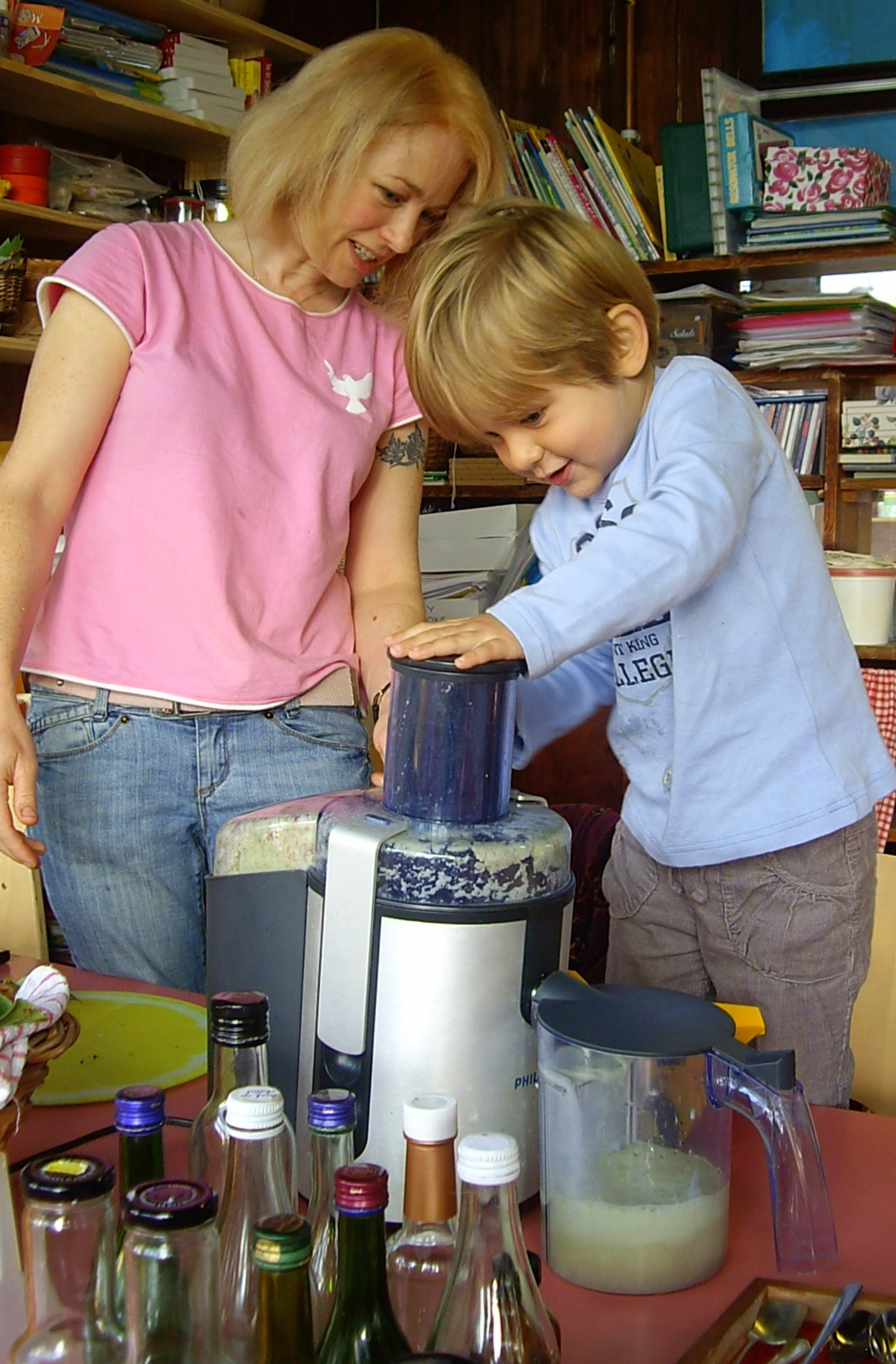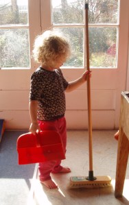 Obviously you wouldn’t actually let a baby do the family ironing (the iron above is not plugged in) but you could let a two or three year old sweep the floor, and after practising for a year or two (and zooming round the kitchen on a brush ‘horse’, whirling your carefully swept-up bits all over the floor, or bopping you on the head with a brush ‘sword’) they should eventually be able to carry out effective dust-gathering sweeping. A four year old could help with the vacuuming and feel a real sense of achievement. I used to feel so proud of the three year old who kept coming up to me and carefully doing all my cardigan buttons up to the neck (her new skill) to keep me warm. I learned to just be patient and sit still if she struggled with it, because if I took over, or declined her kind offer, it robbed her of the sense of achievement and self-worth for ‘helping’! And I had a group of nursery children queueing up to make their own apple juice with my juice extractor. Being Special Helper is a coveted job!