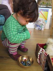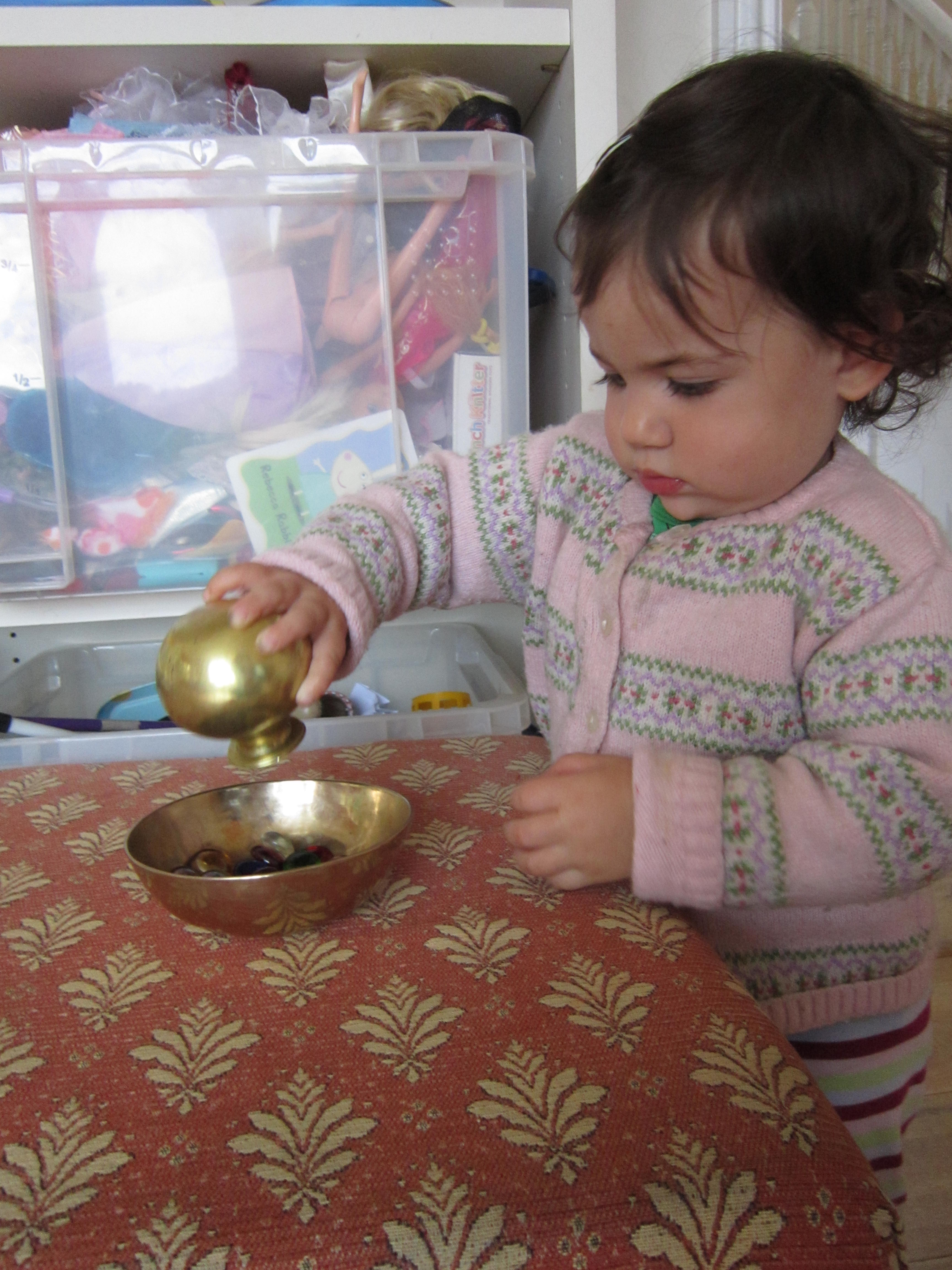 Despite the fact that glass pebbles are sweetie-like, small and classified as a potential choking hazard, I have given several children aged 14 months and up, a handful of glass pebbles to play with. I watch them closely. The little girl shown below, like many others at the same developmental stage, loved to post glass pebbles into the little brass bottle and tip them out into the brass singing bowl, again and again, over and over, massively exceeding the attention span considered ‘normal’ for a child her age. At one point she did try to feel a glass pebble with her lips, and I calmly moved it away, telling her, “Not in your mouth”. She didn’t try it again, being beyond the oral stage and more into object permanence, but played happily for two days with the glass pebbles without incident. (After all, if you wouldn’t give a child this age a large boiled sweet, how would she make the connection between that and a glass pebble?)
