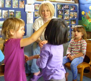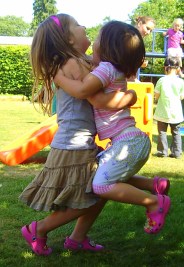 As soon as you sit down on the floor in a nursery, a three year old will usually back up to you and snuggle into your lap. The government guidelines say that physical contact is not appropriate for Early Years workers. But all very young children are excessively physical; they relate to the world in a wholeheartedly tactile way, through their senses. Some nurseries and schools actually ban touching of any kind. But a child feels abandoned and adrift without an anchor! It is only by knowing a trusted adult is there to hold on to, that they can feel secure enough to let go and go off to explore. And they need to learn appropriate ways of touching others by your example; how you touch them will influence the kind of touch they use on their playmates. I have found that they need actual demonstrations acted out by example; words alone just will not get through! (I used to do ‘gentle touch’ demonstrations at Nursery when the children had been rough with each other.)