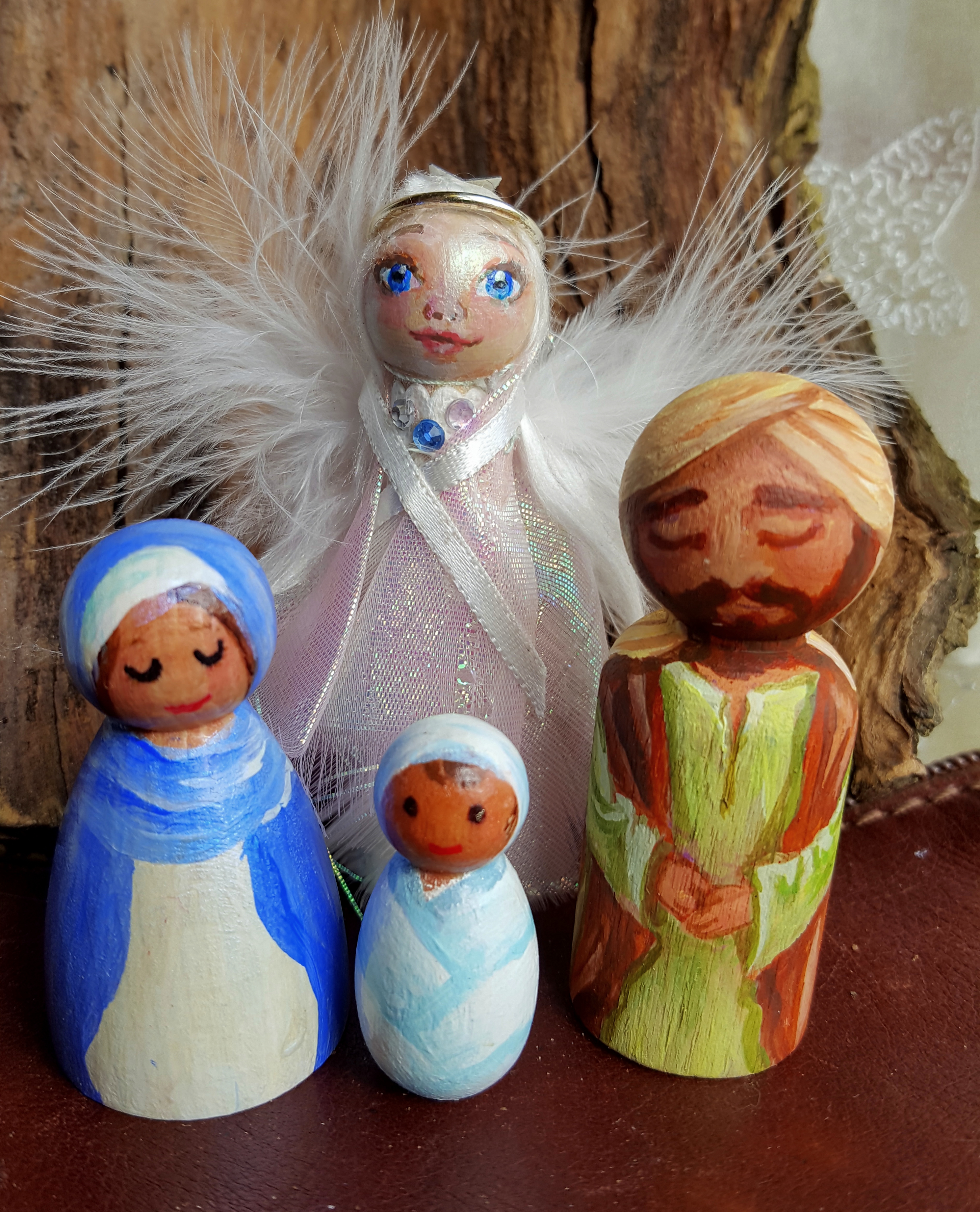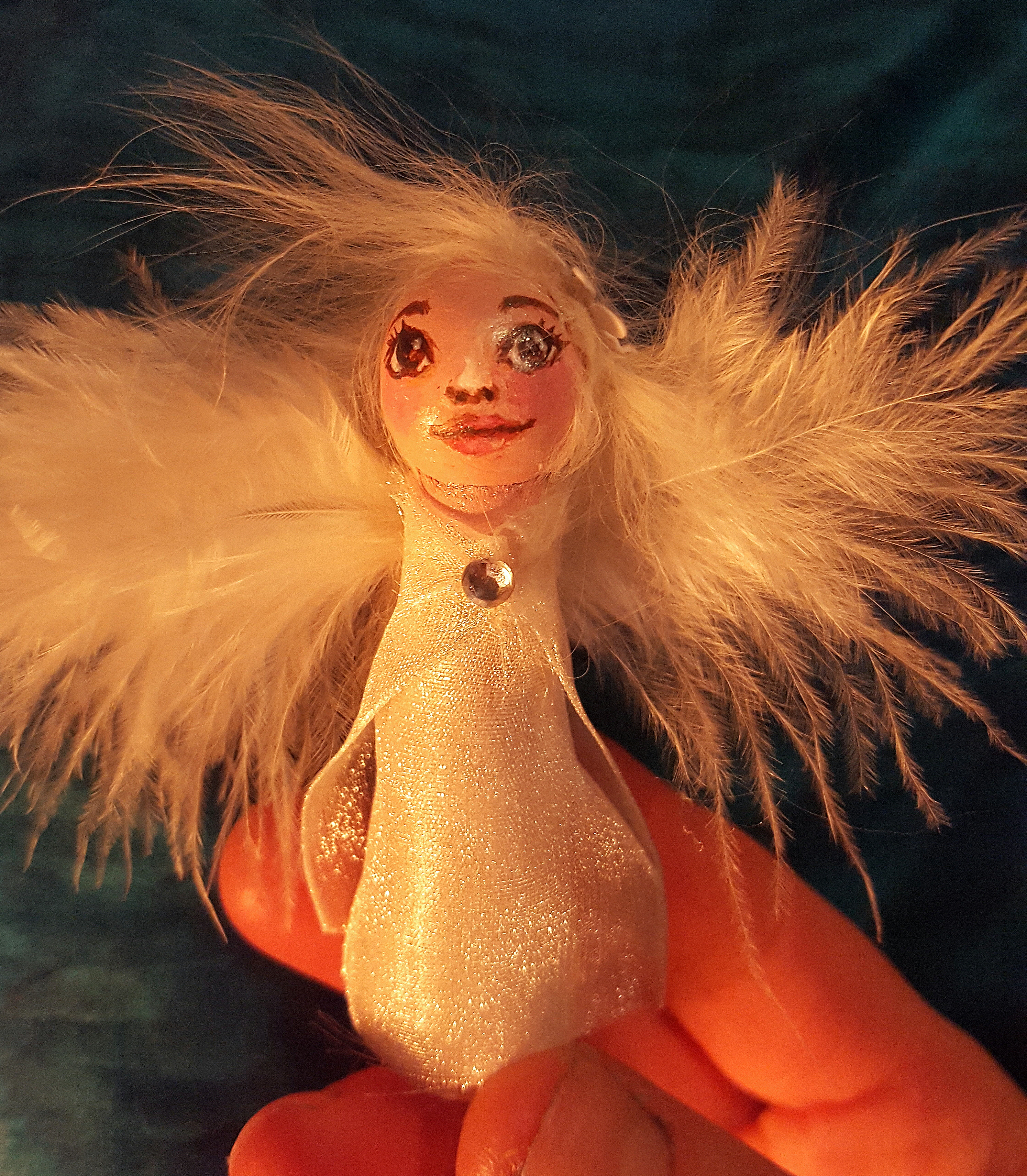 I then felt like more of a challenge and decided to ramp it up a notch. My brain started fizzing with different characters: elves and fairies, animals, angels, deities, kings and queens. I really enjoyed putting more detail into the faces and making weeny costumes and hair, although part of me was torn – I didn’t want to be creating a handmade version of all those plastic character toys the shops are full of, and I know the value of very simple playthings in developing imagination….but I couldn’t help it, it was too much fun! I comforted myself with the thought that at least my characters are unique individuals and not a spin-off from a movie. And I found another use for those acorn cups too…