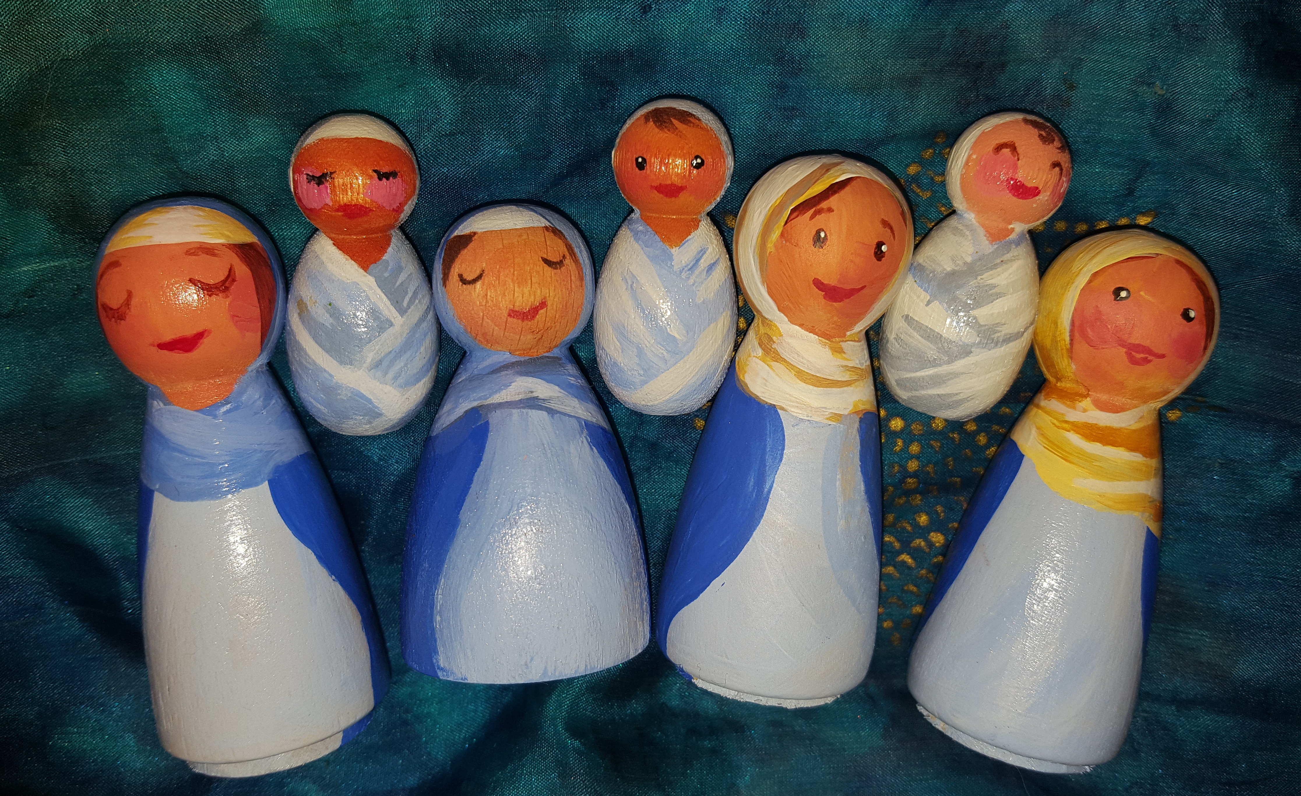 I recently came across some little wooden peg doll figures on the internet, saw that people were painting them and wanted to have a go at this myself. I couldn’t afford the rainbow set made by well-known German Waldorf toy manufacturer Grimms, so I started off by making my own rainbow set…..