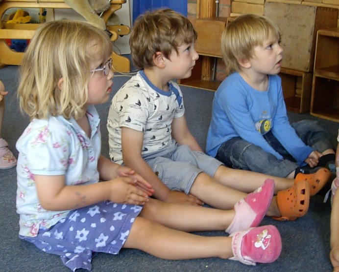 A variation on this theme is “I’m in Heaven” where they can be whatever age and do whatever they wish. E.g. “I’m in Heaven and I’m gonna be eight and ride a bike without stabilisers and give Grandpa a ride on the back!!!” All mime along to this scenario, then another child has a go and all copy him.