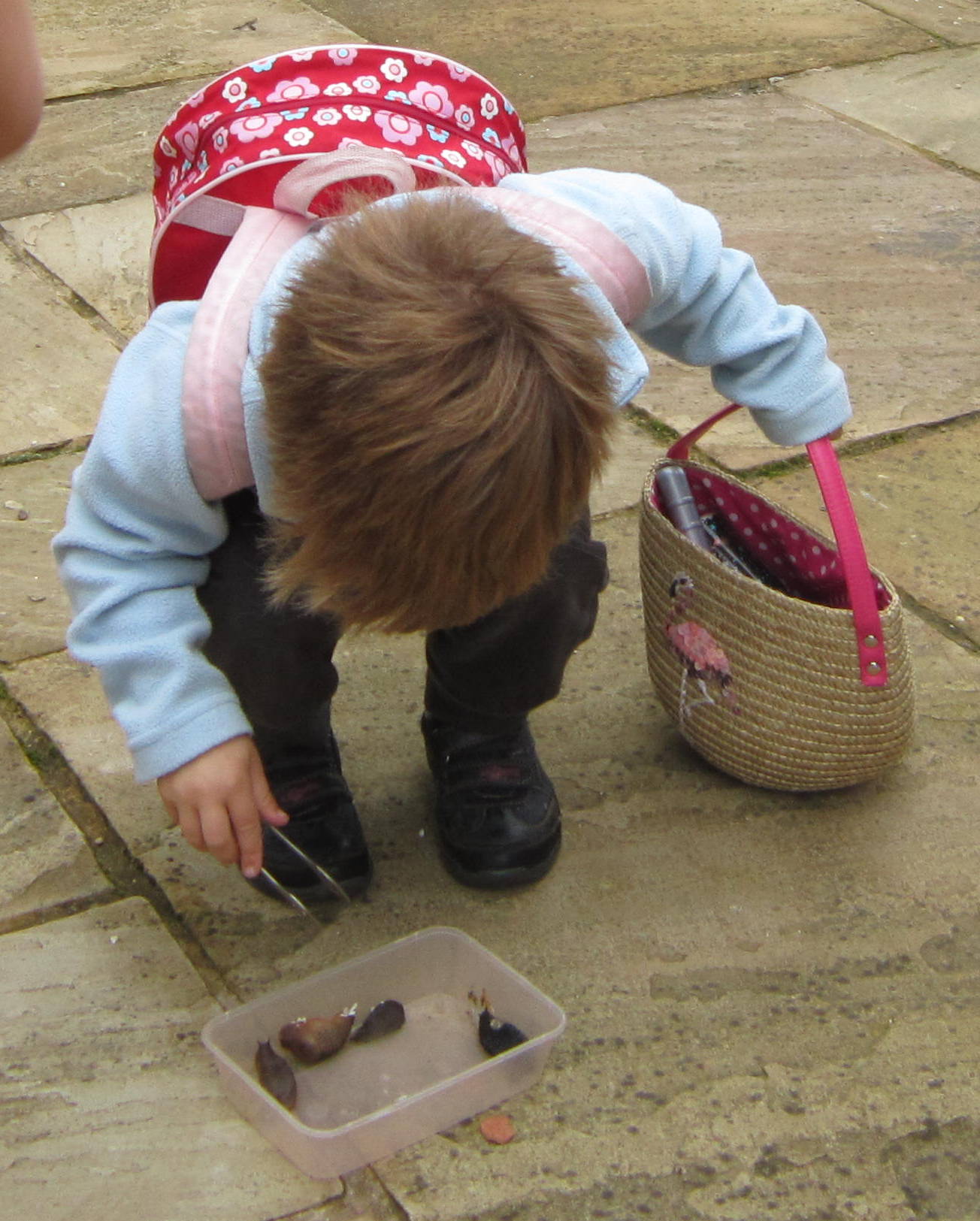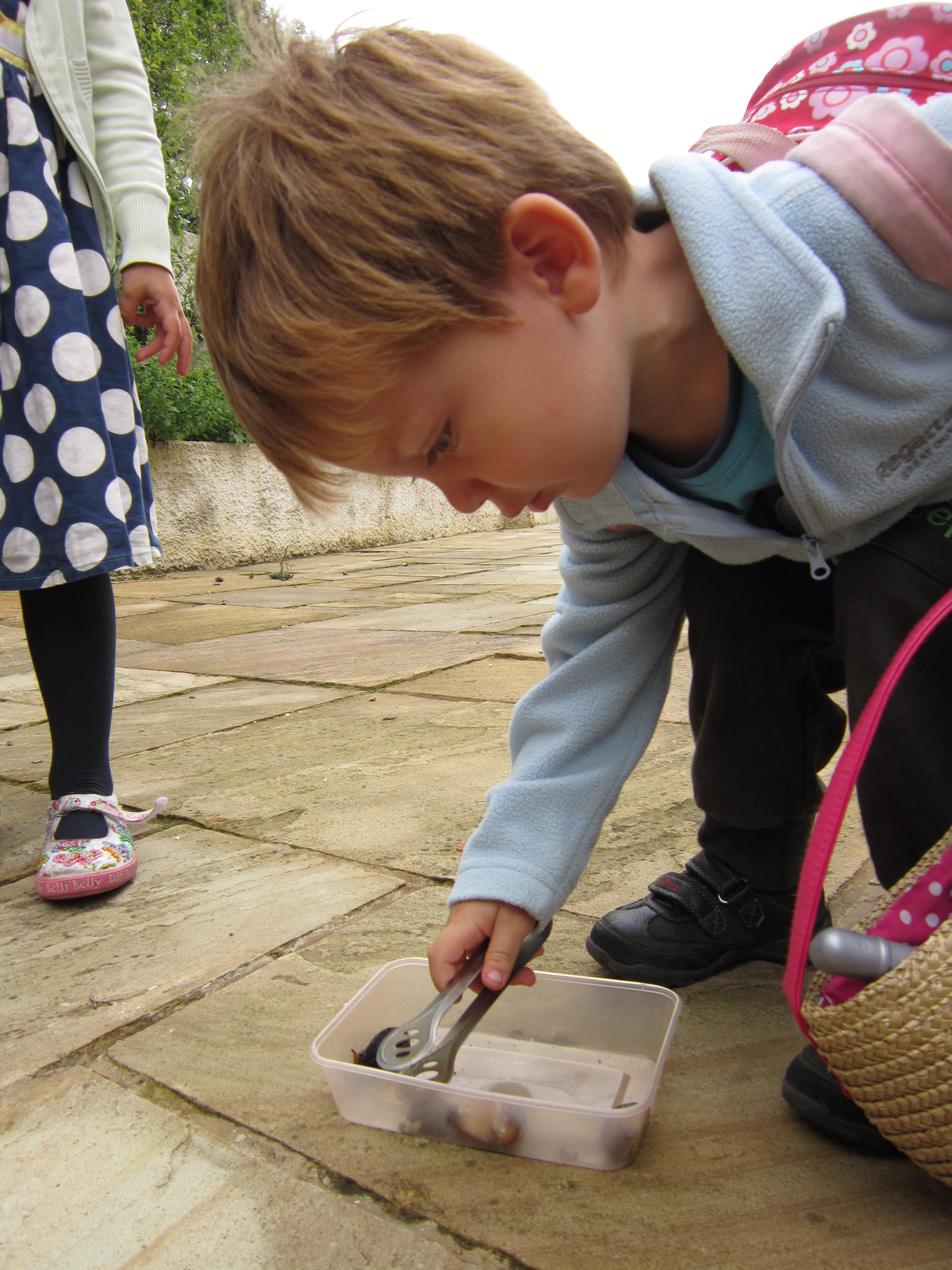 Inspiration hit when I saw they wanted to actually collect the slugs up in a receptacle. I gave them a pair of old tongs and a plastic pot and said, “See how many you can find! It’ll be like a treasure hunt, they’re hiding all over the garden. You can pick them up with these tongs, pop them in the pot and when you have ten, just tip them into the compost heap and watch them munching up the compost!”