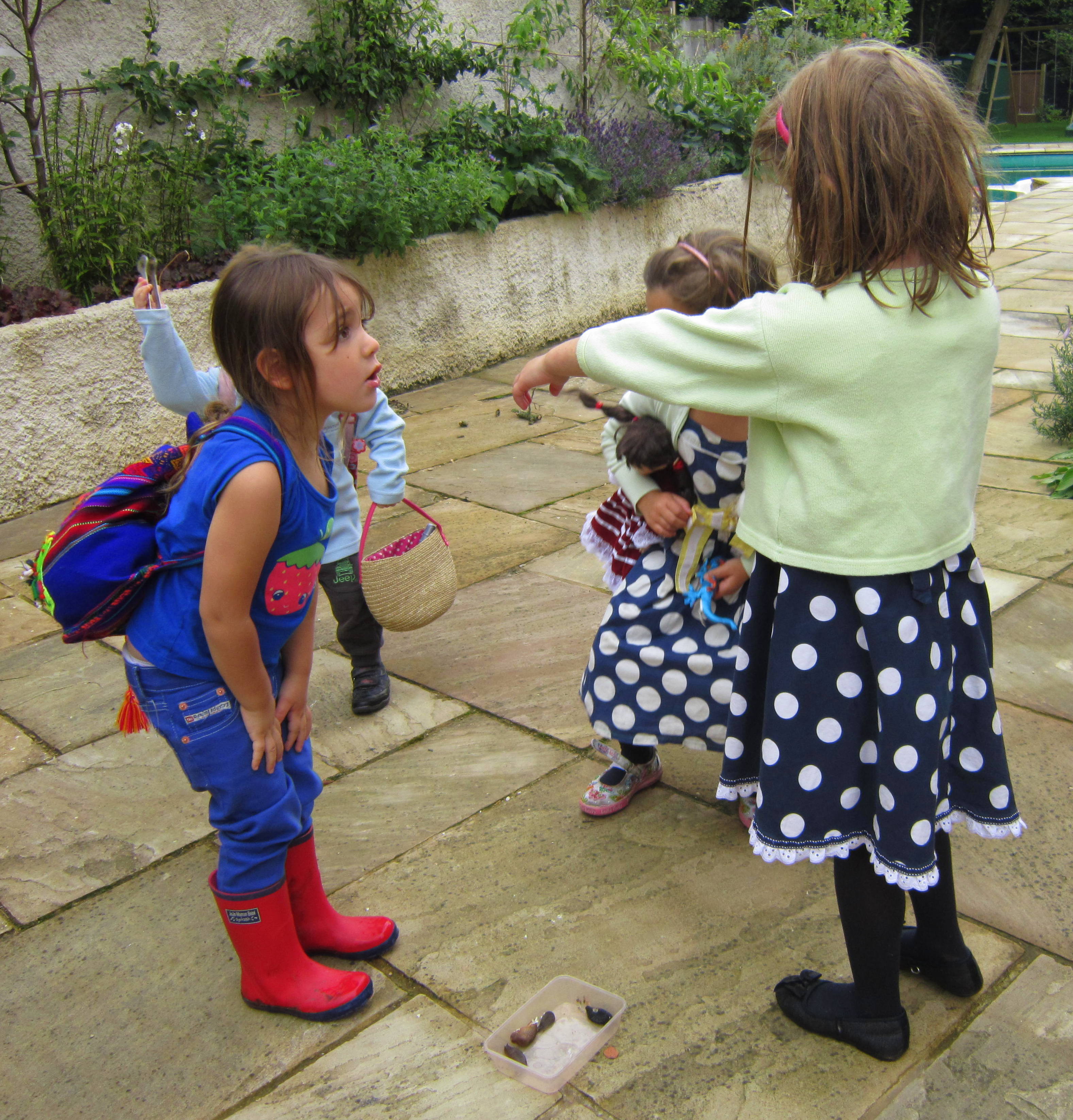 Today the rain stopped for a minute, so before they started tearing each other to pieces (their energy levels tend to peak around 10am), I planned to take the kids to the park (with my pop-up tent). But they were so excited to have their little cousin round to play, that they all put on backpacks full of teddies and decided to go on a slug hunting expedition in the garden. This was apparently wildly exciting, as slugs are a little like SCARY MONSTERS and might CHASE them into the house!!!