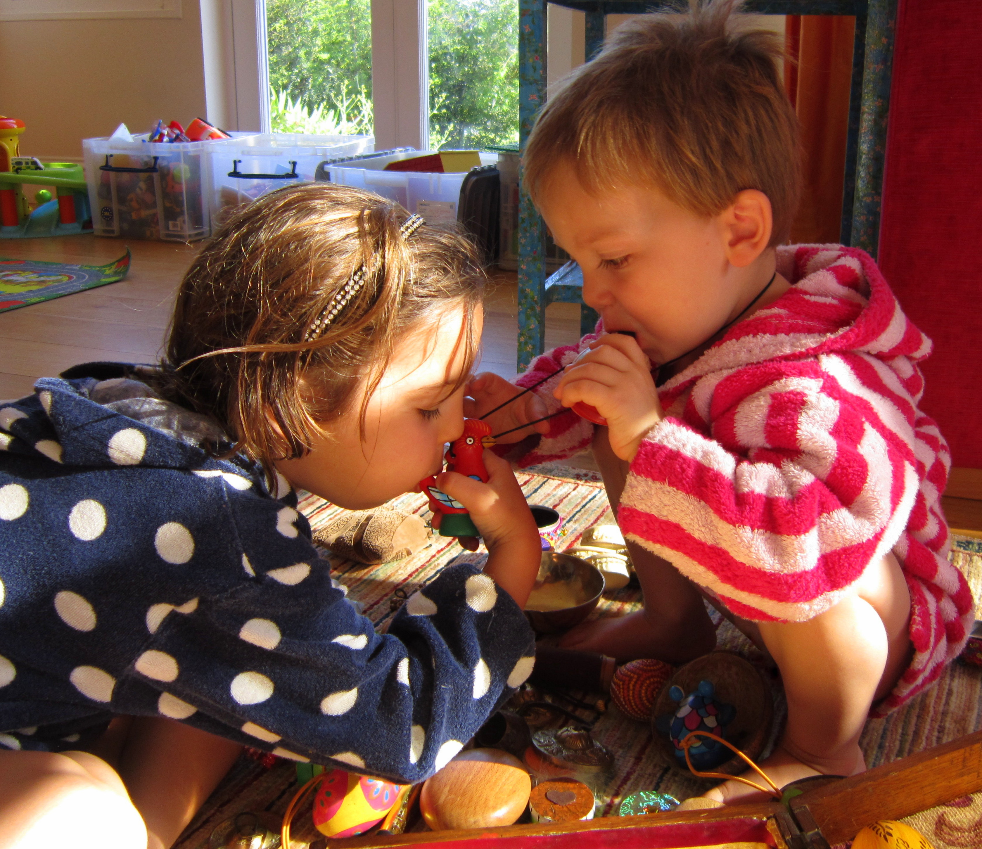 The youngest child, although not yet one and a half, knows exactly what he need to learn in this moment. He has turned his back on his plastic collection to post copper pipe end stops into a little brass bottle and then empty them into half a coconut. He does it over and over again. He is doing this to forge new pathways in his brain. He is learning object permanence (where an object disappears but he realises it still exists and can find it again) and refining his hand-eye coordination (controlling where he wants stuff to go) and small motor skills (picking up titchy things). These deceptively simple objects are part of the Sound & Music Box.